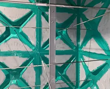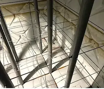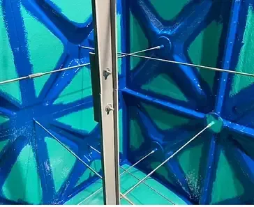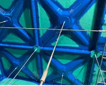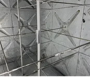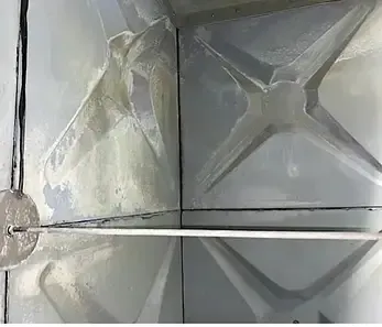 Our client was a very large office block with multiple sectional GRP tanks relined as part of a major water system refurbishment. This was a duplex tank with each compartment sized at 4.0 x 4.0 x 3.0m. The tank was suffering from gel coat deterioration and jointing mastic failure. Additionally it had hollow lid supports that required replacing.